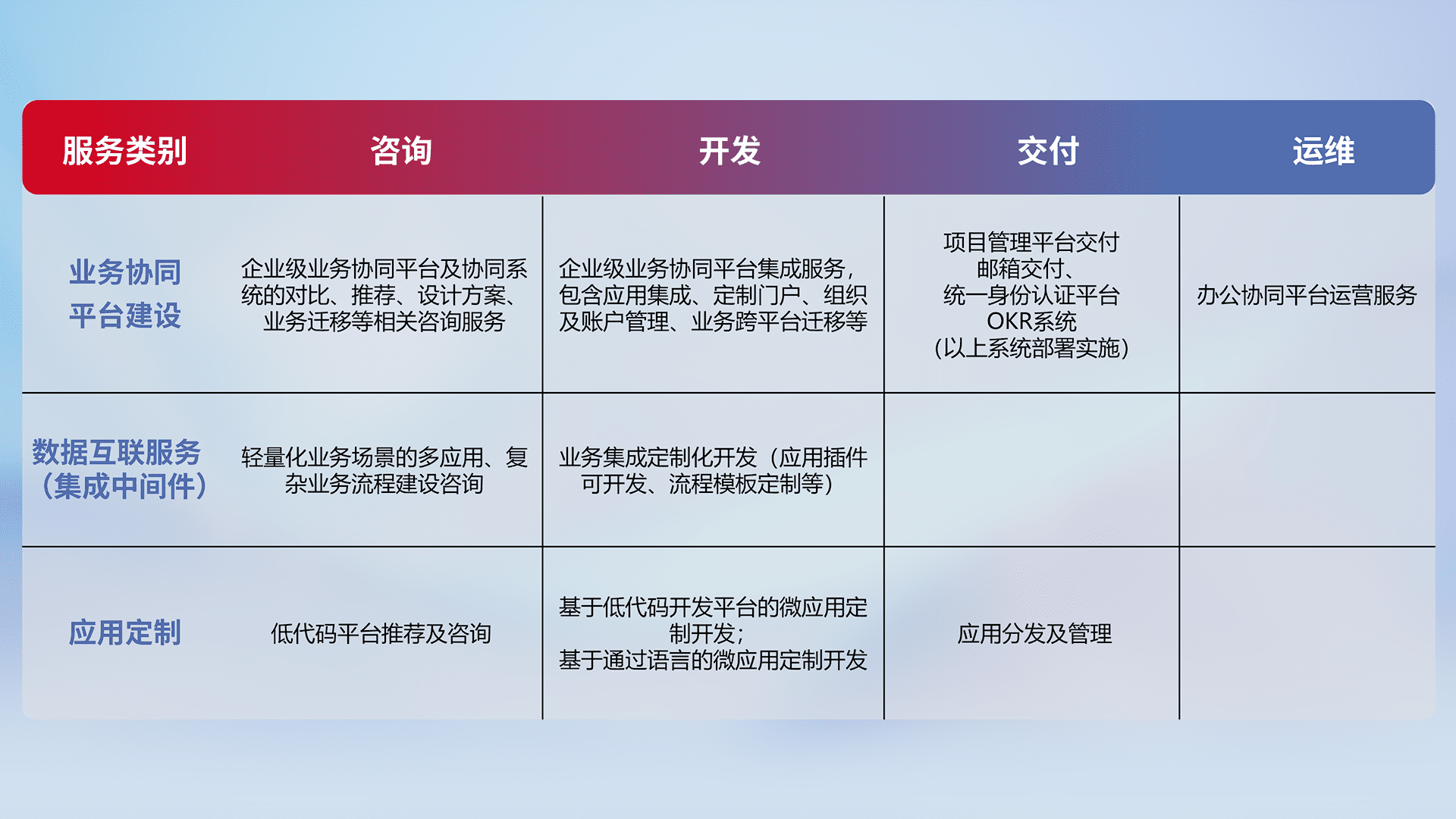 针对钉钉、、、、企微、、、、IDaas等平台级产品提供产品的规划、、、方案、、交付、、、、定制化开发等服务,,,,实现如统一协同办公、、、智能客户服务、、、、混合会议管理、、、智能数据查询、、、、等业务场景,,,,实现数字化转型。。