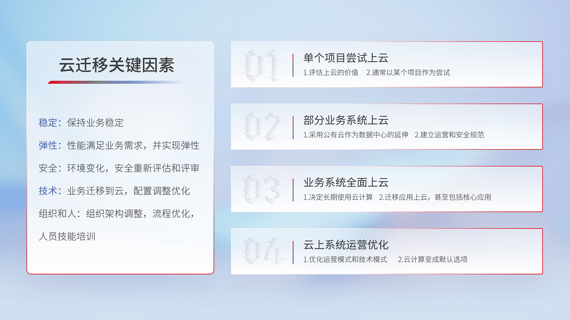 结合实际业务,,,从规划设计、、、、云平台选型、、、、云原生改造、、数据迁移、、、集成交付,,,迁移全过程为客户识别最佳上云路径,,做好风险识别管理,,,设计网络架构、、、、身份权限、、、安全审计合规、、、、操作审计、、、、日志审计、、、监控告警策略、、多站点容灾设计等,,,,对云上基础设施进行整体规划,,提升IT治理水平,,以满足弹性、、、高可用、、、、高性能的需求。。。。