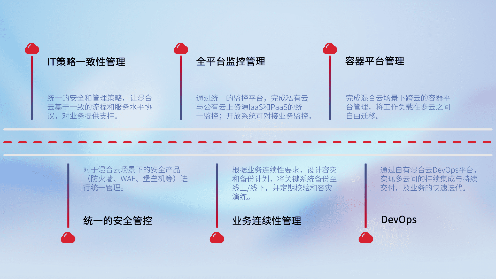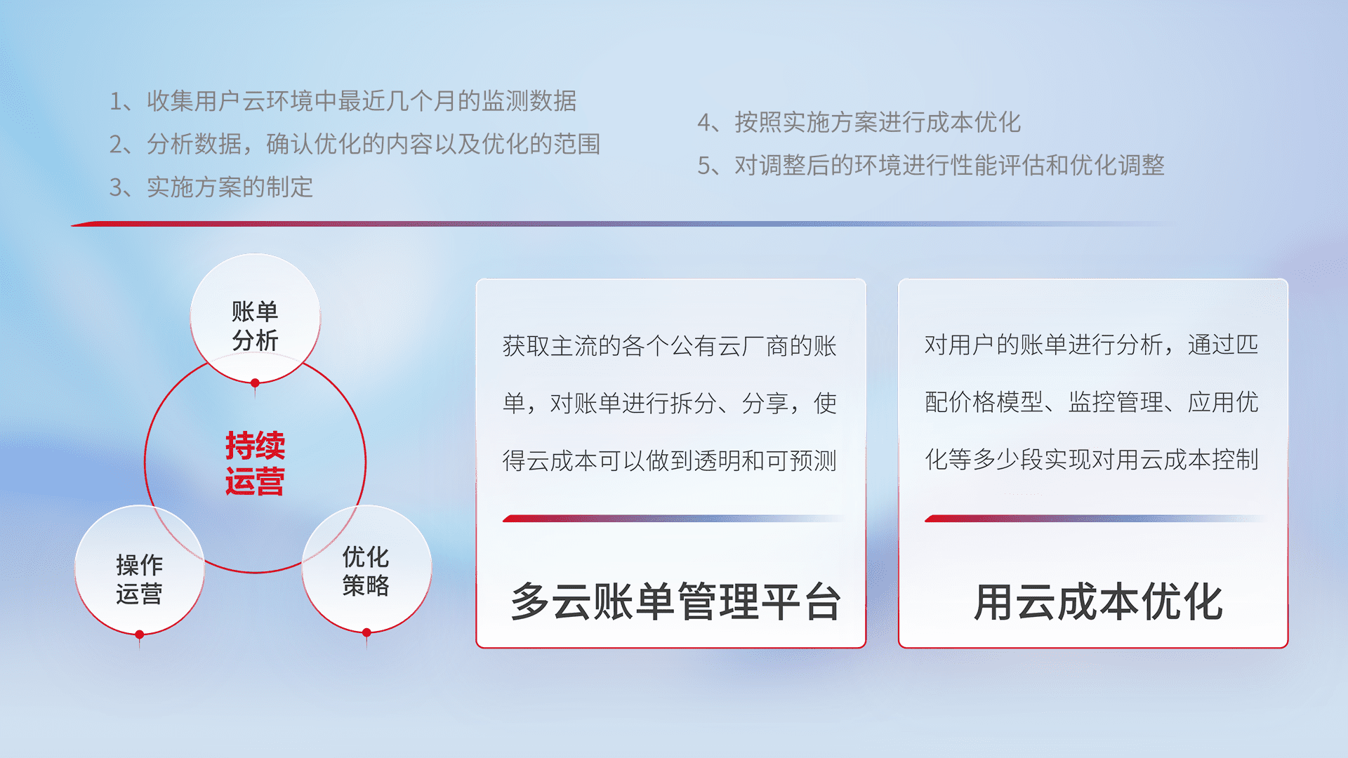 通过多云纳管,,,以统一的资源数据模型把客户的云资源进行抽象和封装,,,进而实现对多云资源的统一操作,,,保障云资源管理的可靠性、、、、稳定性与可用性。。量身定制化运维内容,,配置、、、、开发运维、、、补丁管理、、、、备份、、、监控、、、、认证和访问管理、、、审计和日常巡检等,,,保障在用云过程中的可靠度,,,稳定度以及高可用率。。